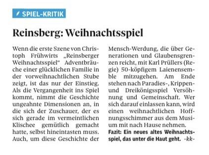 Christoph Frühwirth hat für sein im Dezember 2025 erstmals stattfindendes „Reinsberger Weihnachtsspiel“ die Geschichte rund um die Geburt Jesu Christi neu gedacht und in Szene gesetzt. Er folgt bei seinem abendfüllenden Theaterstück der Idee von Franz von Assisi, die Weihnachts-Geschichte in der Umgebung des Aufführungs-Ortes spielen zu lassen. In drei Akten werden die Vertreibung aus dem Paradies, die Herberg-Suche und der Besuch des Christus-Kindes durch die Drei Könige von und mit Reinsbergern dargestellt.